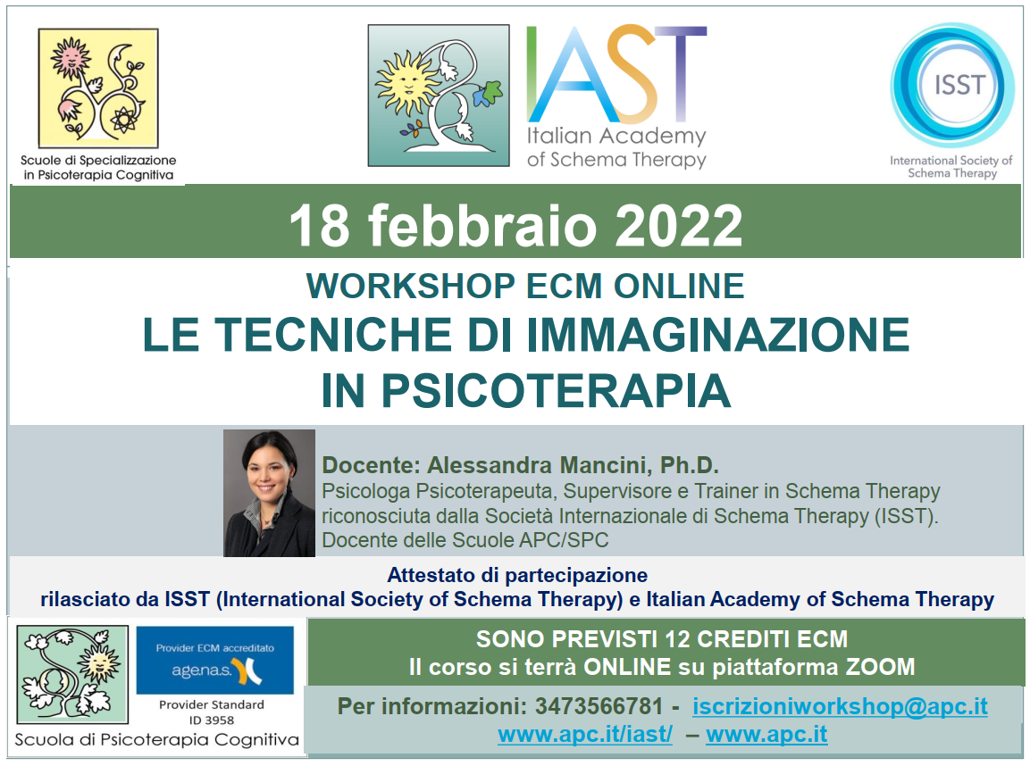 tecniche immaginative (Imagery diagnostico, lmmaginazione del posto sicuro, lmmaginazione con l’ Adulto Sano, Imagery with Rescripting). Particolare Attenzione sarà dedicata all’Imagery Rescripting, che permette al paziente, attraverso il recupero di episodi passati, di vivere un’esperienza emotiva correttiva modulando al contempo le credenze disfunzionali