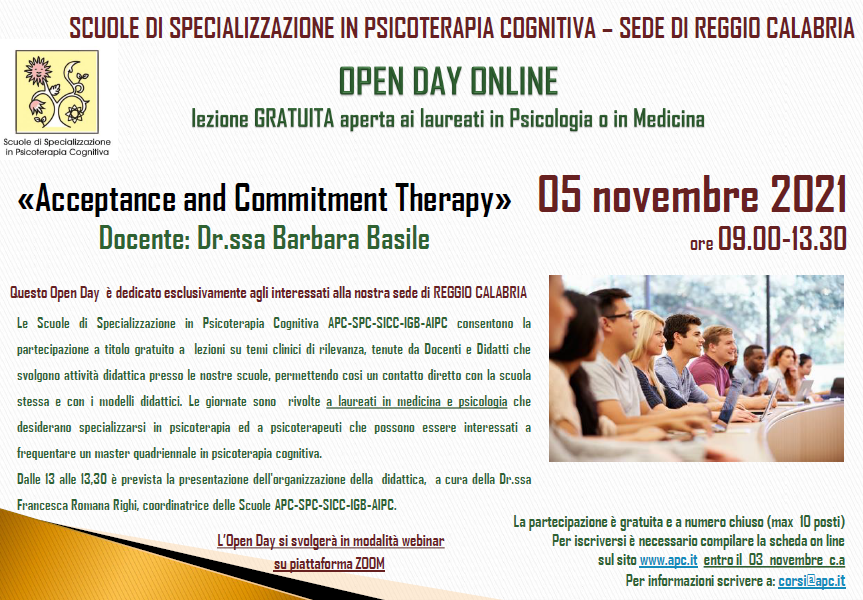 Le Scuole di Specializzazione in Psicoterapia Cognitiva, APC-SPC-SICC-IGB-AIPC consentono la partecipazione a titolo gratuito a lezioni su temi clinici di rilevanza, tenute da Docenti e Didatti che svolgono attività didattica presso le nostre scuole, permettendo cosi un contatto diretto con la scuola stessa e con i modelli didattici. Le giornate sono rivolte a laureati in medicina e psicologia che desiderano specializzarsi in psicoterapia ed a psicoterapeuti che possono essere interessati a frequentare un master quadriennale in psicoterapia cognitiva.