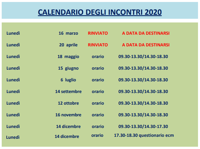 A seguito delle disposizioni governative sull’emergenza sanitaria coronavirus, i primi tre incontri del Gruppo Supervisione con il Dr. Lorenzini (18 maggio, 15 giugno e 6 luglio) si terranno in modalità webinar da remoto tramite piattaforma ZOOM.
